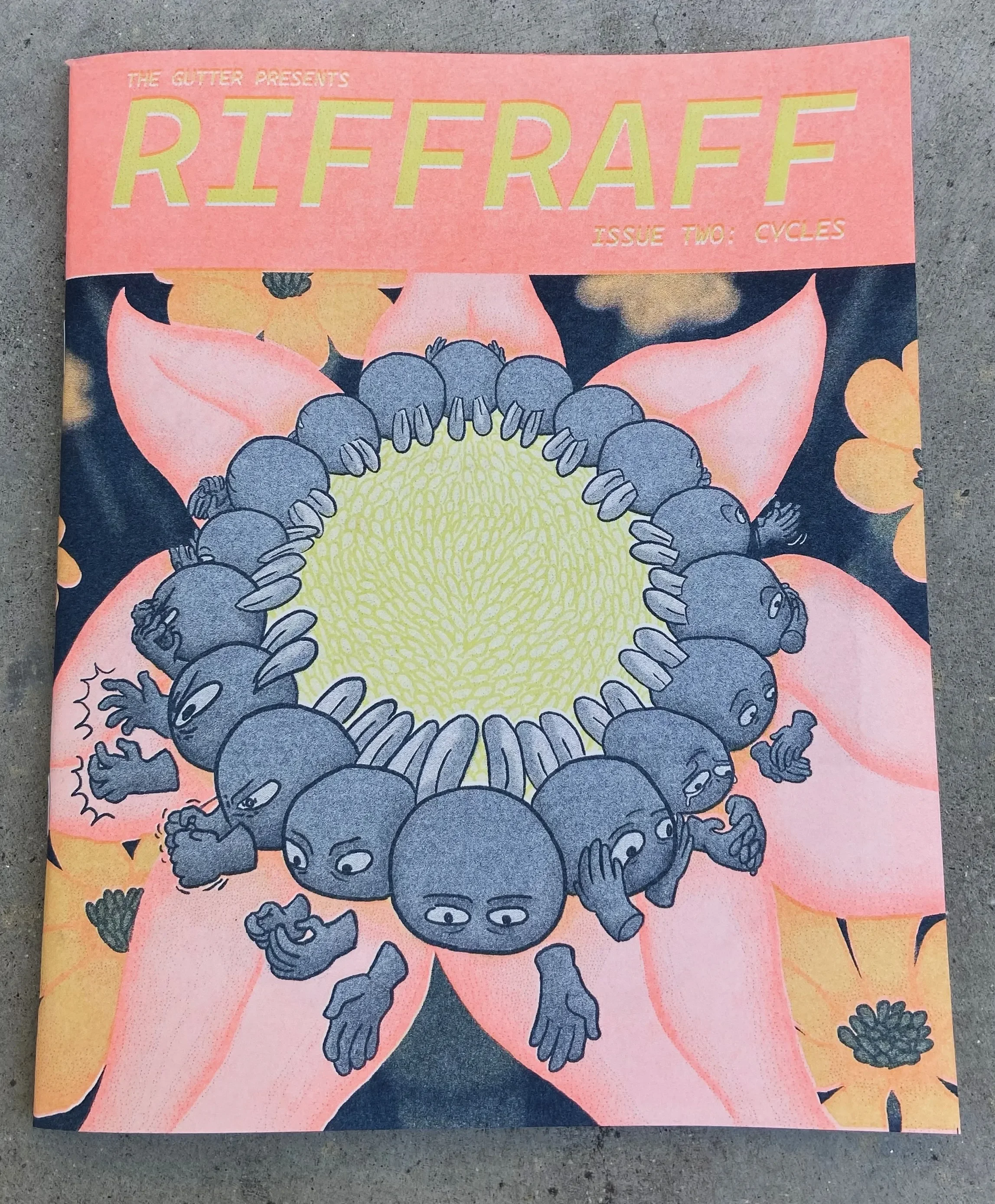 The Gutter’s second comics anthology: 52 page saddle stitched book, blue interior, 7” x 8.5.” Printed by Risograph at Punch Kiss Press, LA.