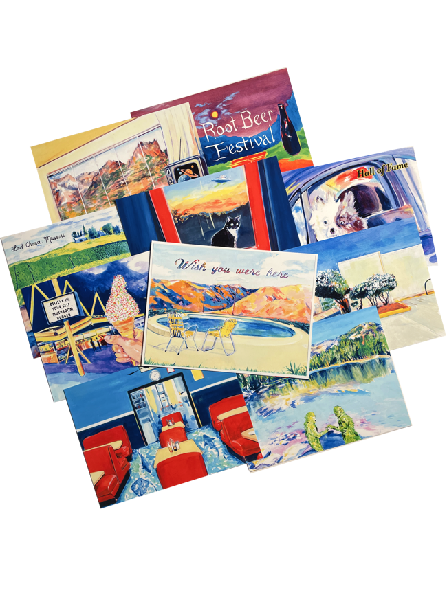 Fictional comic composed of postcards that one person writes to a mysterious recipient over the course of their youth.10 full color postcards. 8 include story, 2 are unwritten. Packaged in printed envelope. 5” x 7”.